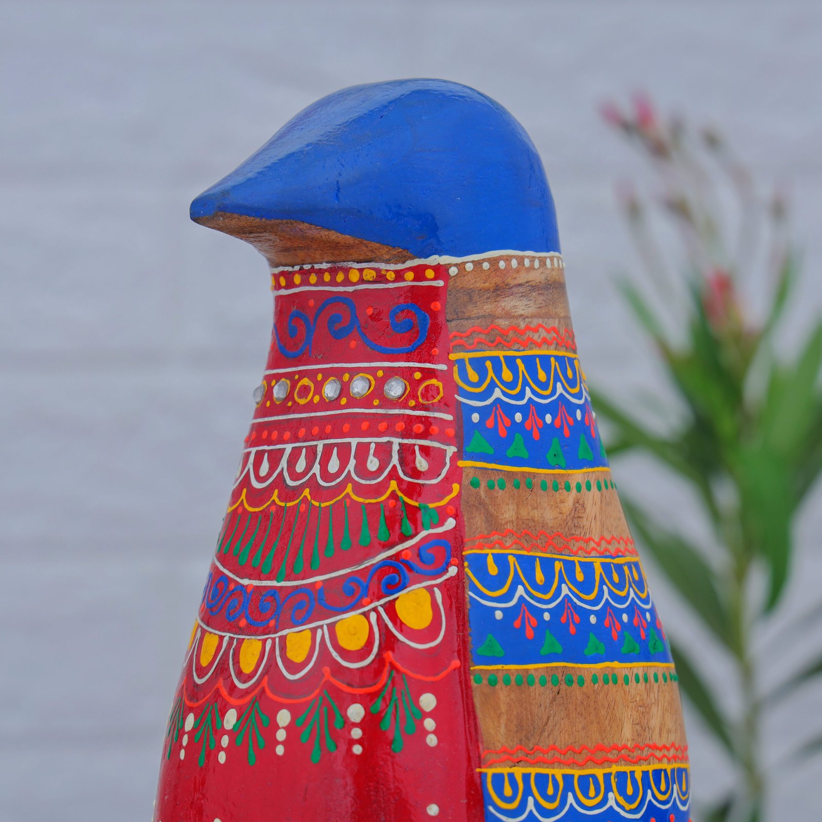 Featuring a tall, elegant bird form with a deep blue head and intricately hand-painted body in vivid hues of red, yellow, green, and blue. Traditional Rajasthani motifs wrap around its body, with stunning attention to detail and cultural expression.