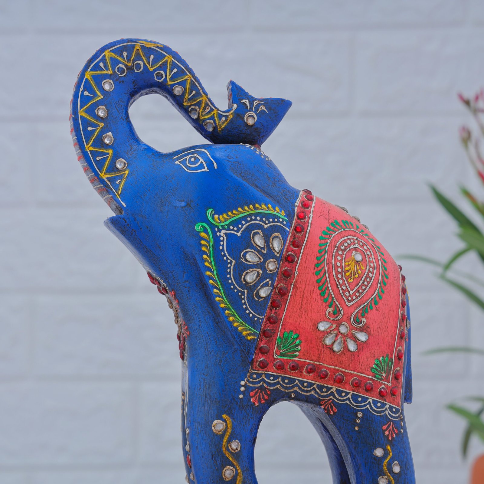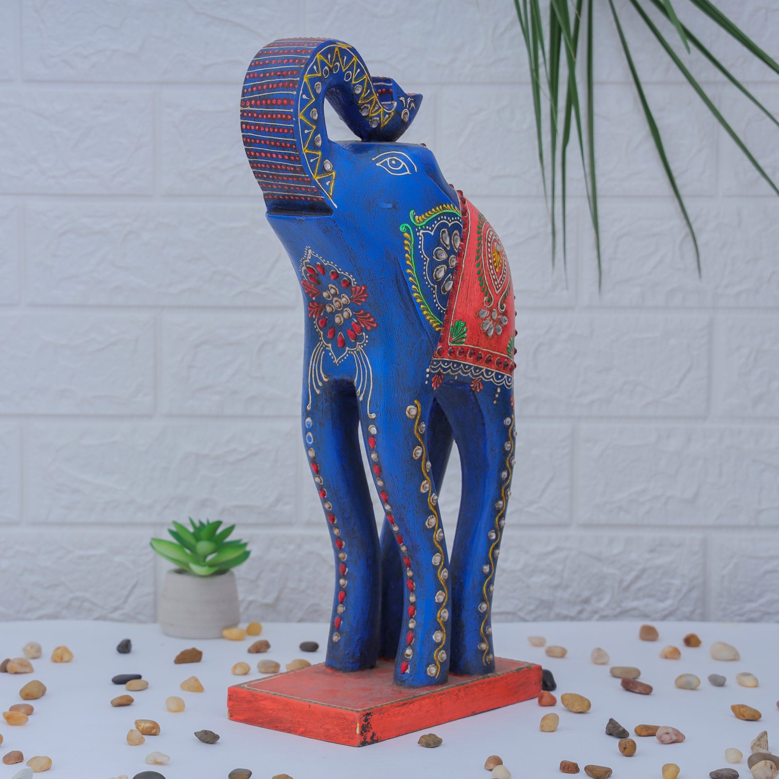 Make a bold statement with this majestic hand-painted tall elephant figurine, a symbol of wisdom, power, and prosperity. Crafted with care by Rajasthani artisans, this striking piece is adorned with intricate patterns and vibrant colors that reflect the rich heritage of Indian folk art.