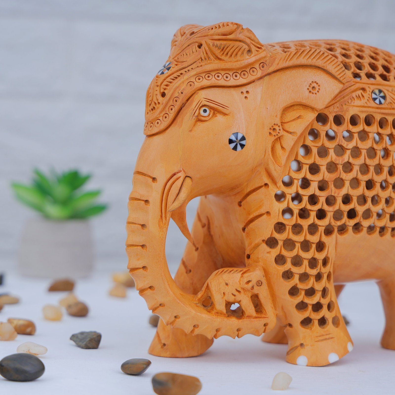 Hand-Carved Wooden Elephant with Baby Inside – Jali Work