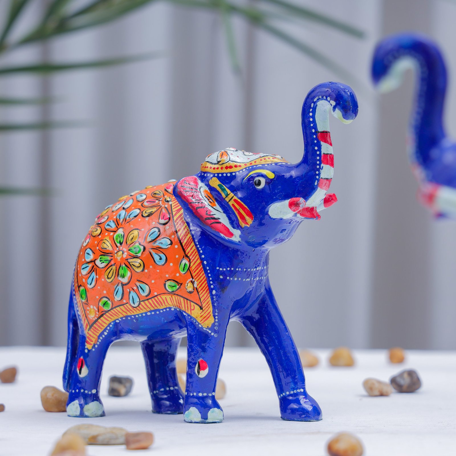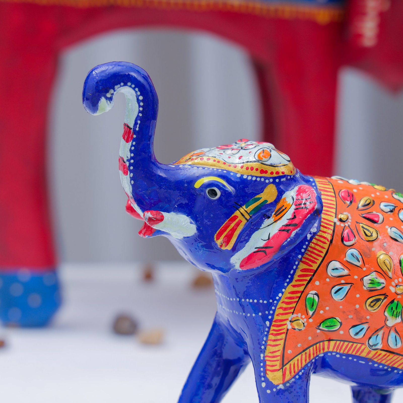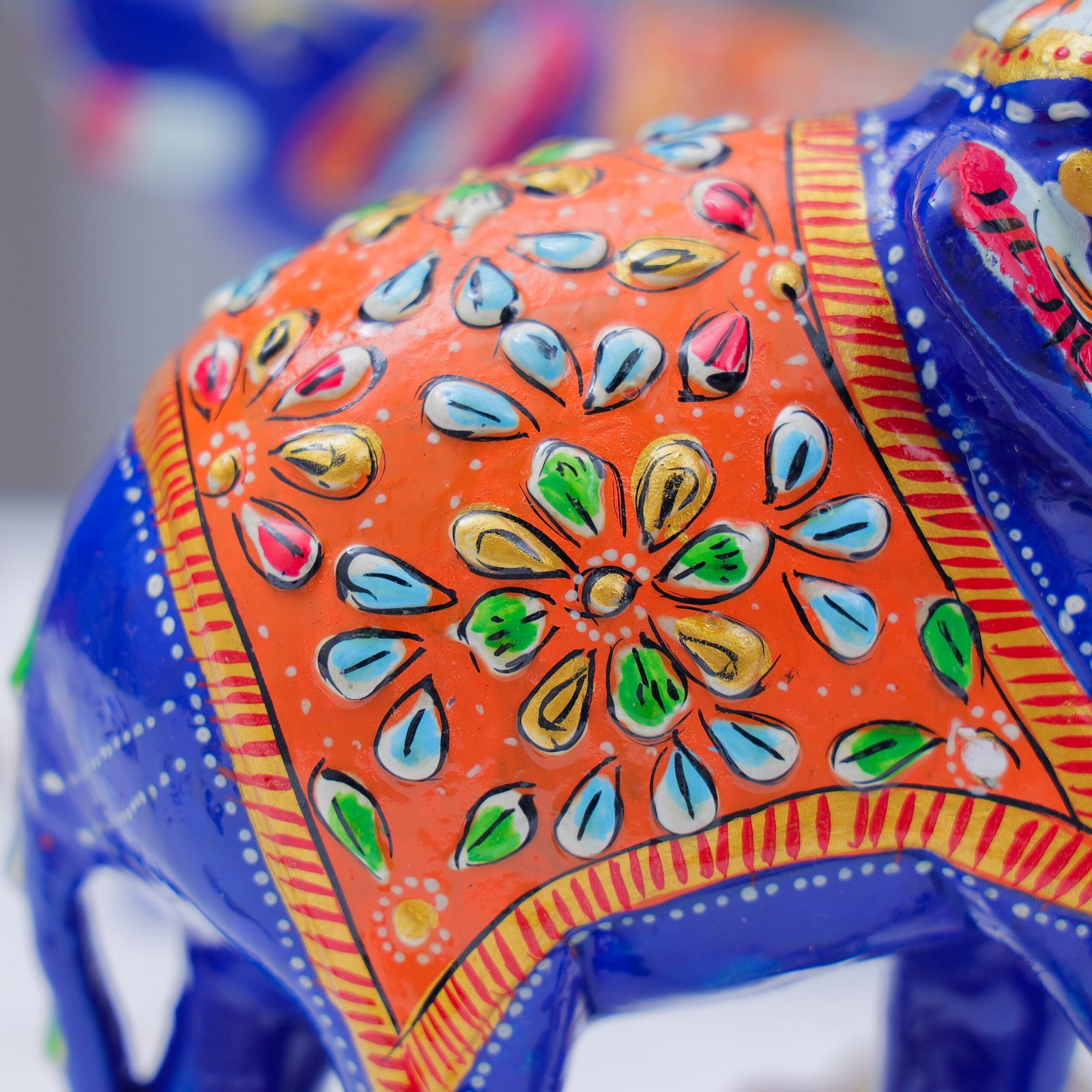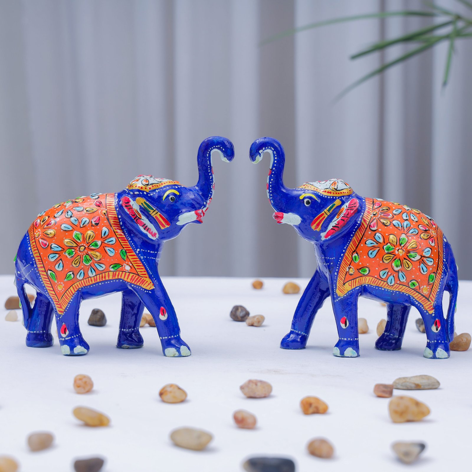 Add a vibrant touch of tradition and royalty to your décor with this stunning Hand-Painted Elephant Pair crafted from wood. These majestic elephants are adorned in bright blue and orange hues, beautifully decorated with floral motifs, and finished with intricate detailing by skilled Rajasthani artisans.
