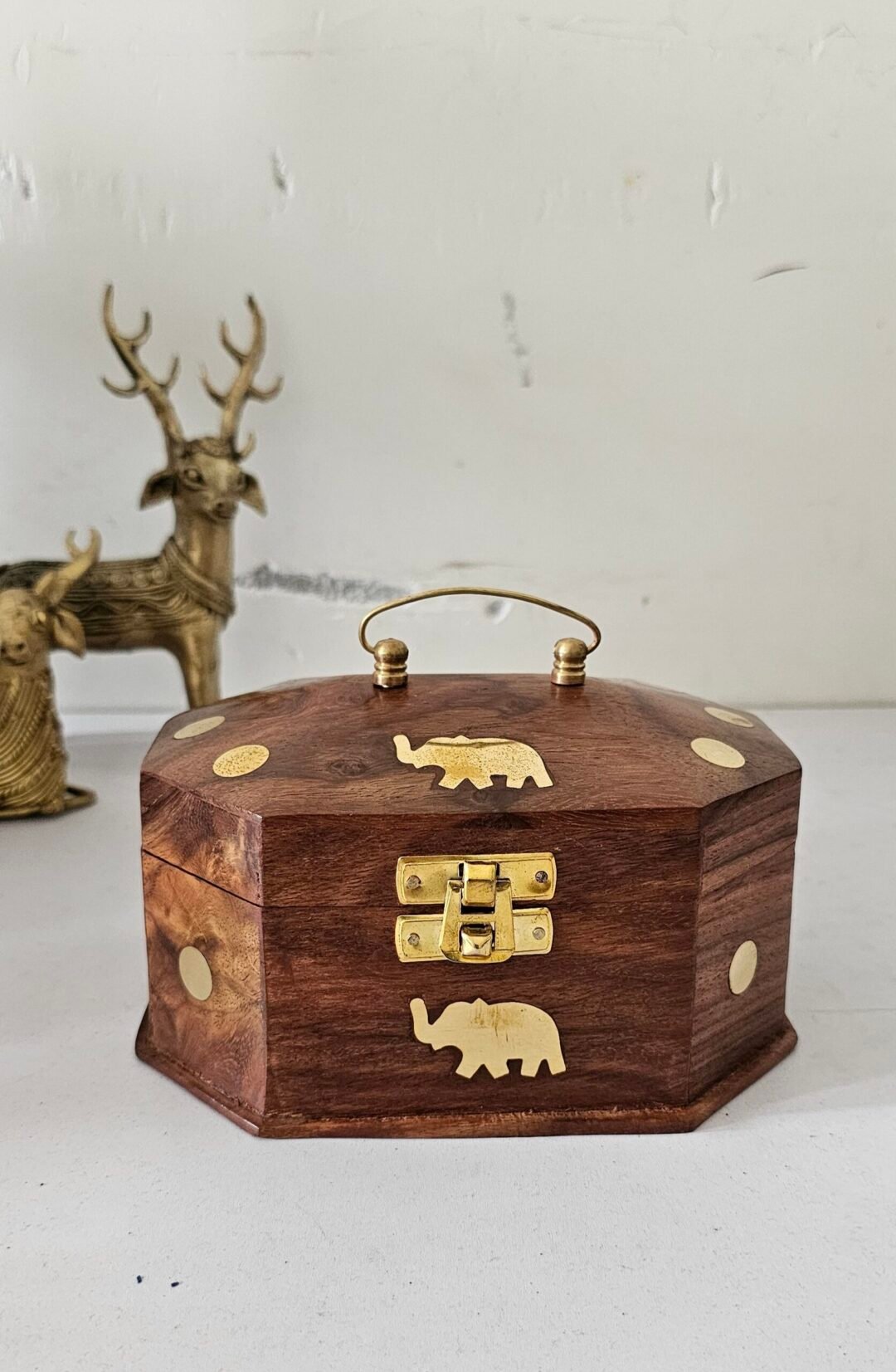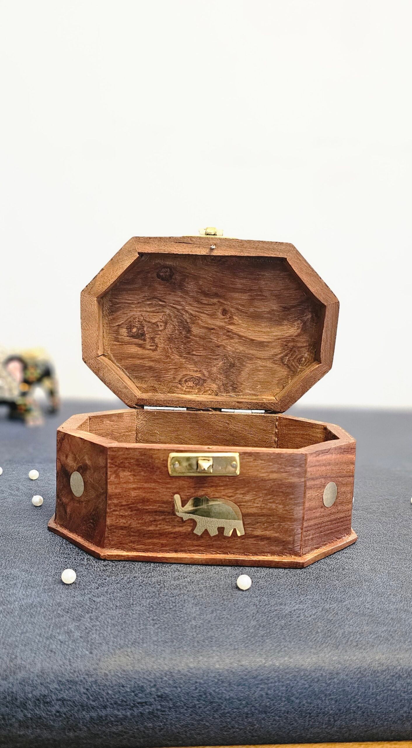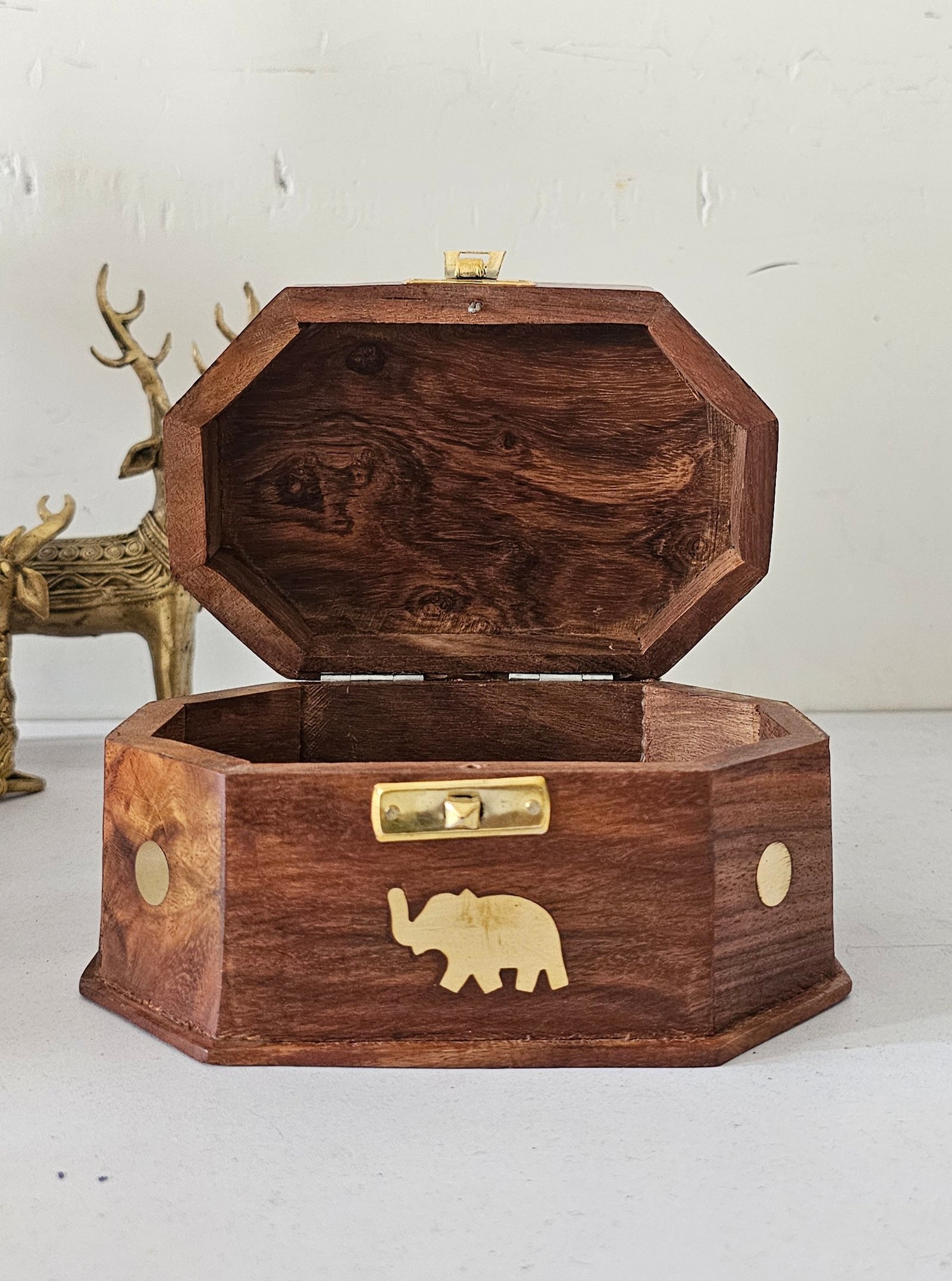 Elevate your storage style with this beautifully handcrafted wooden jewelry box, designed to combine traditional artistry with practical elegance. Made from premium quality wood, this octagonal box features a rich natural finish and a secure brass latch closure. The centerpiece is a charming brass elephant inlay, symbolizing strength and wisdom — a perfect nod to Indian heritage.
