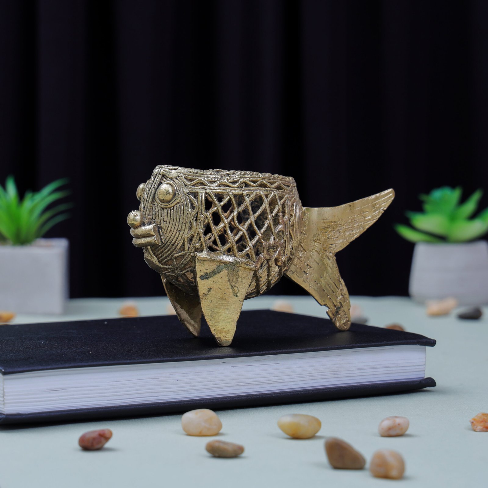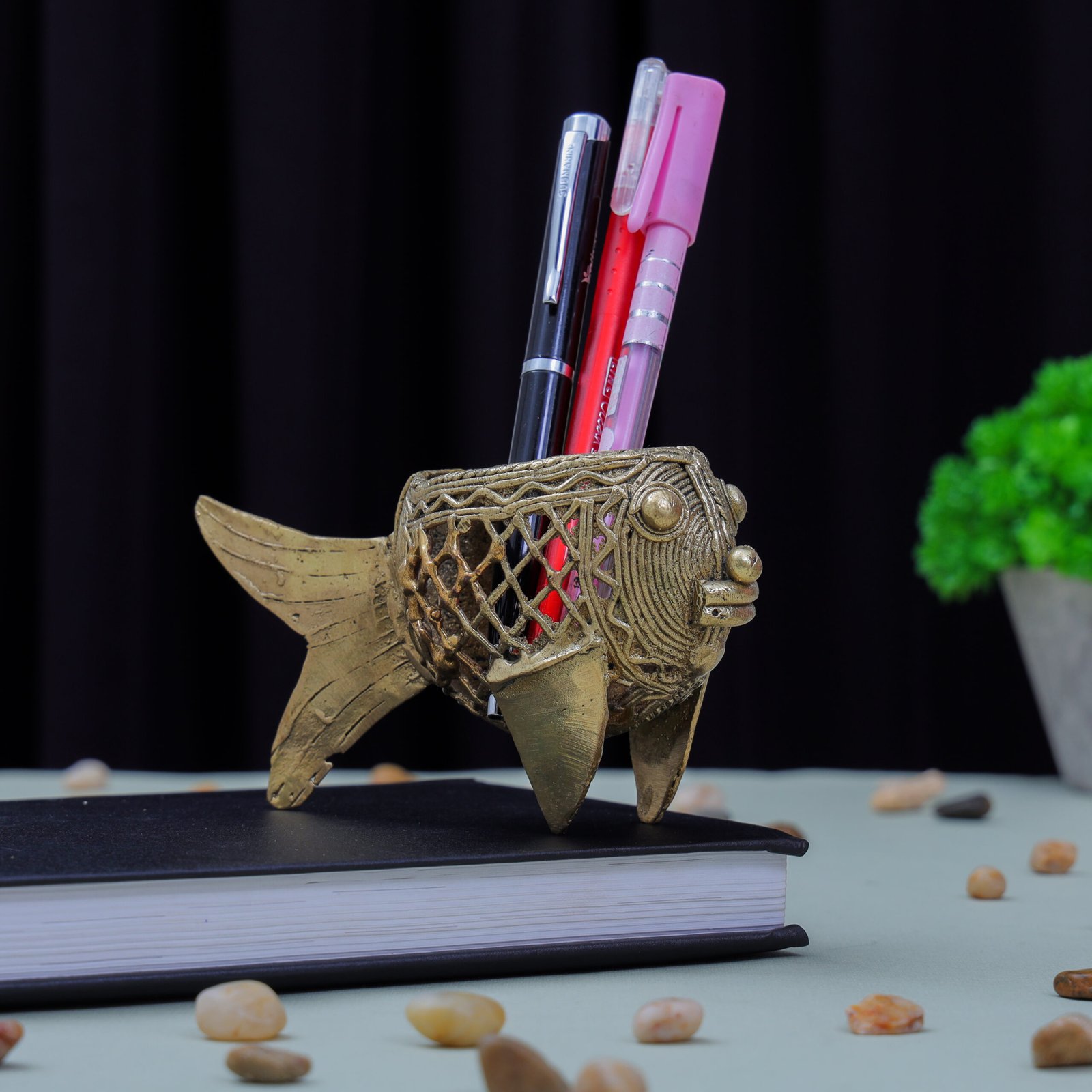 Made by skilled tribal artisans of India, each pen stand reflects the centuries-old Dhokra tradition. The fish symbolizes good luck and creativity — making this piece perfect for workspaces and artistic corners.